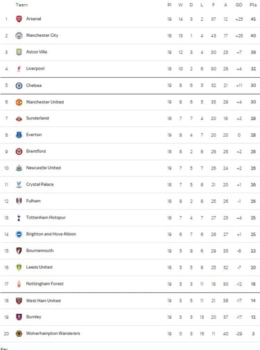 Above: Premier League standings going into the new year.