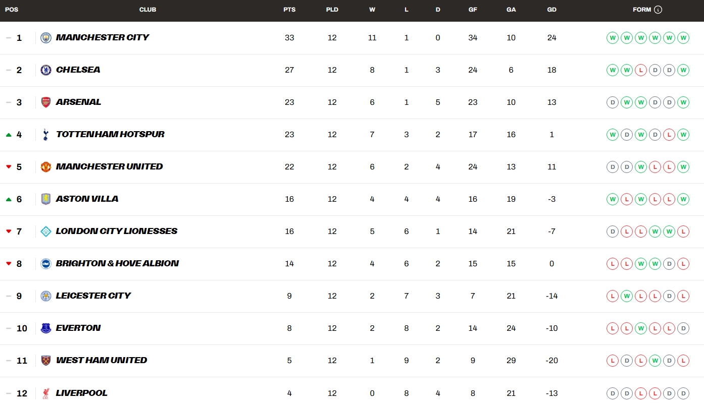 Elsewhere, London City Lionesses face Manchester City at Hayes Lane in Bromley. The hosts are winless since 23rd November and face a daunting challenge against league leaders Manchester City, who are currently on an 11-game winning run. The Lionesses sit seventh and could climb to sixth with a victory, depending on other results. City ran out 4–1 winners in the reverse fixture, with goals from Vivianne Miedema, Laura Brown and Khadija Shaw.